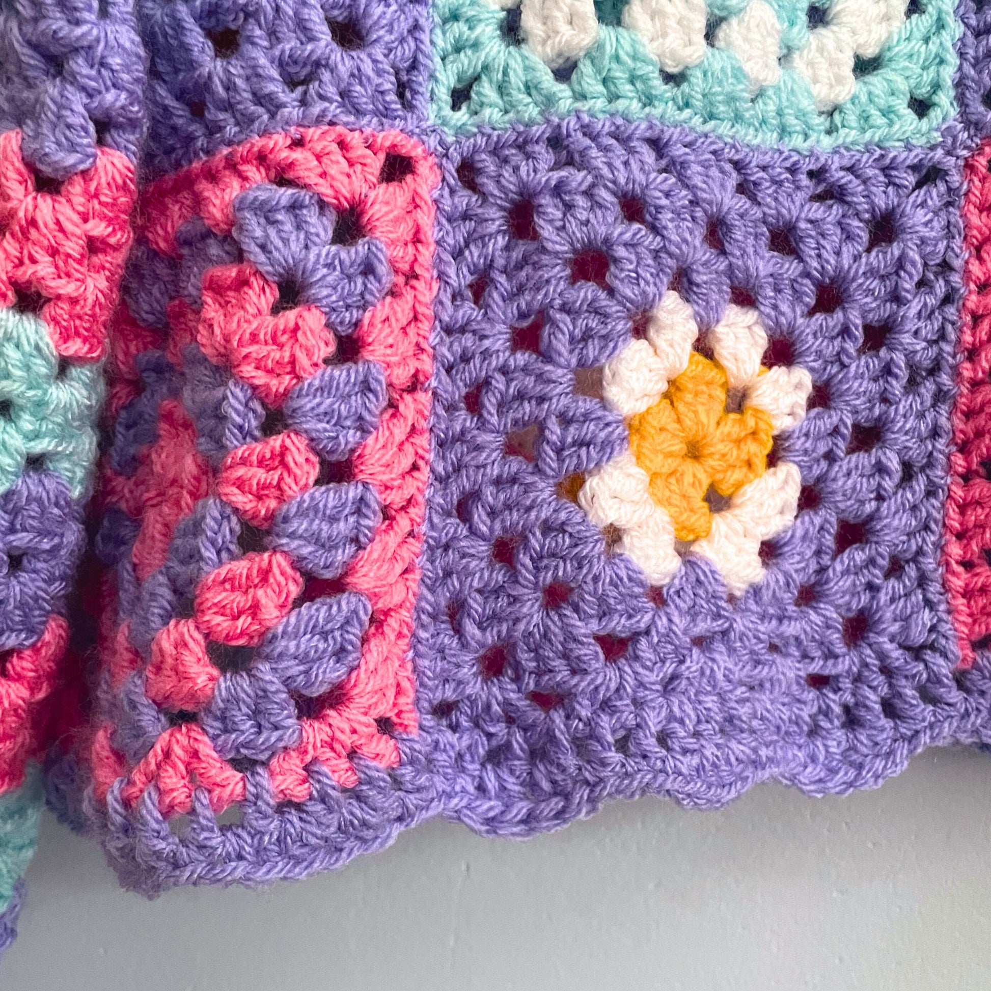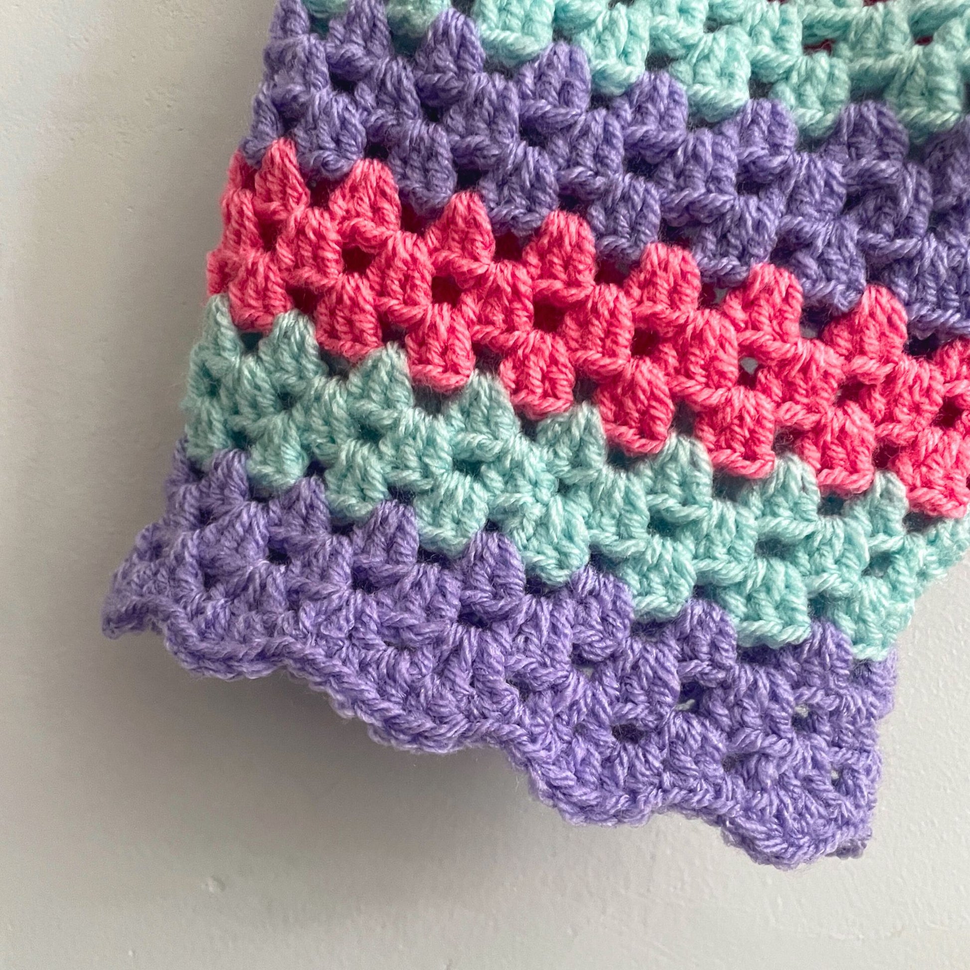 Patchwork pastel crochet jumper with chunky striped sleeves and scalloped cuff details. This is a one-off sister version of my pastel cardigan, handmade with love using super-soft acrylic yarn in the yummiest selection of pastel shades.