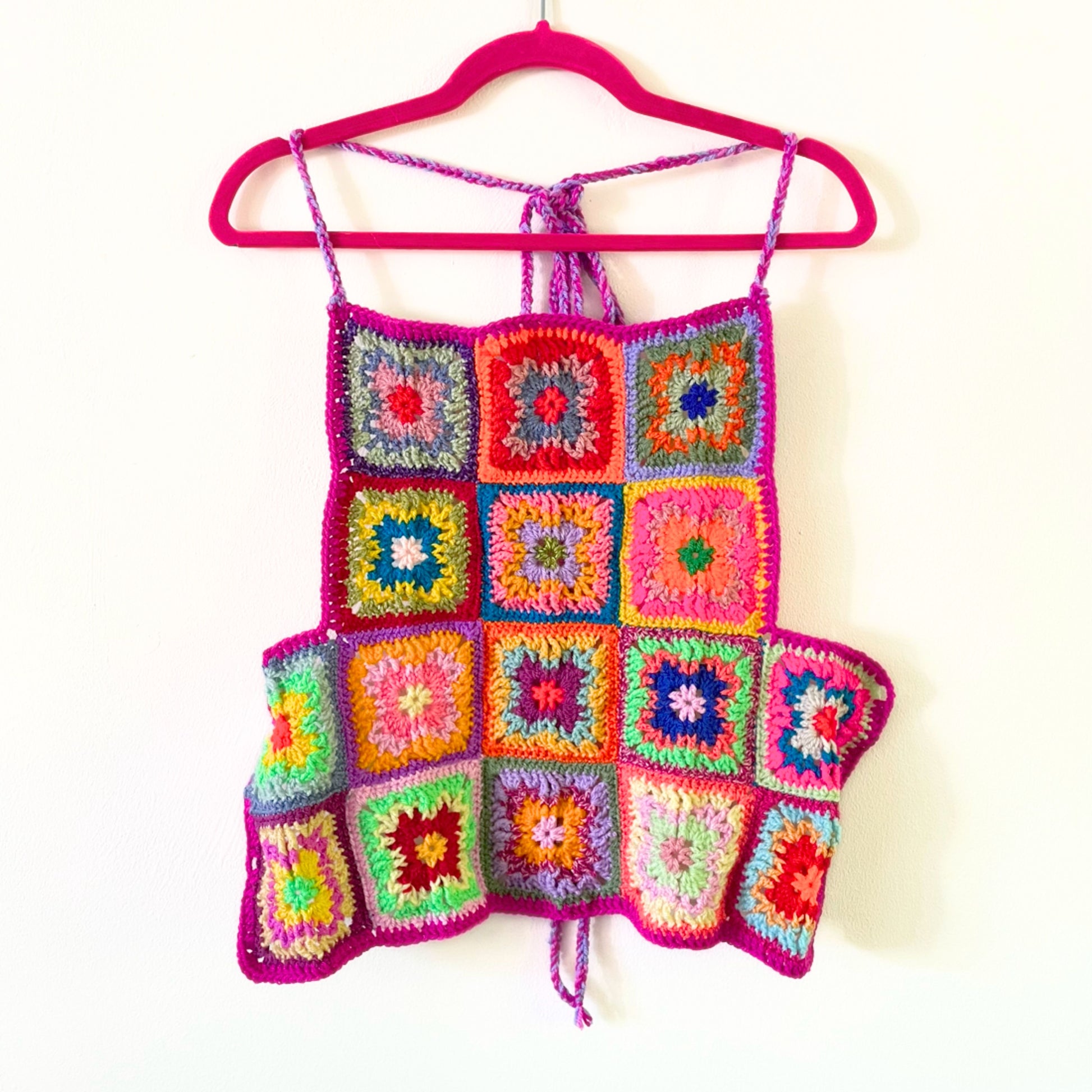 Handmade rainbow crochet squares, sewn together to make a backless, corset style top that can be fully adjusted to fit you perfectly. There are only 2 of these tops, and both fit a UK size 10-12 well - shown on a size 10 in photos for reference. Both tops are the exact same fit/style with a different combo of squares.