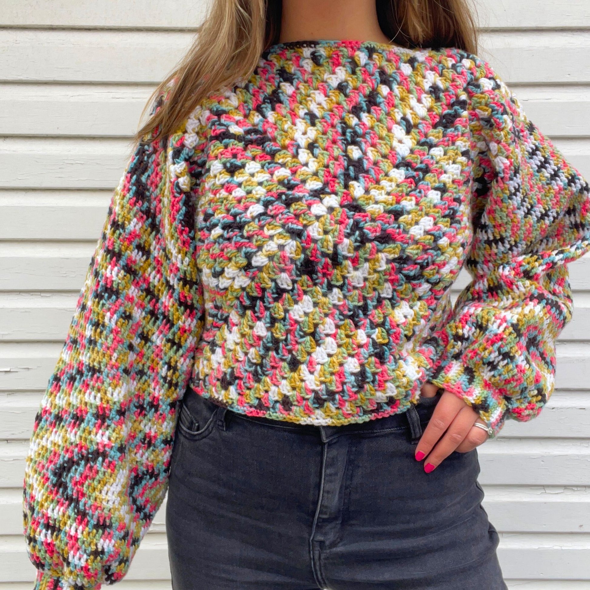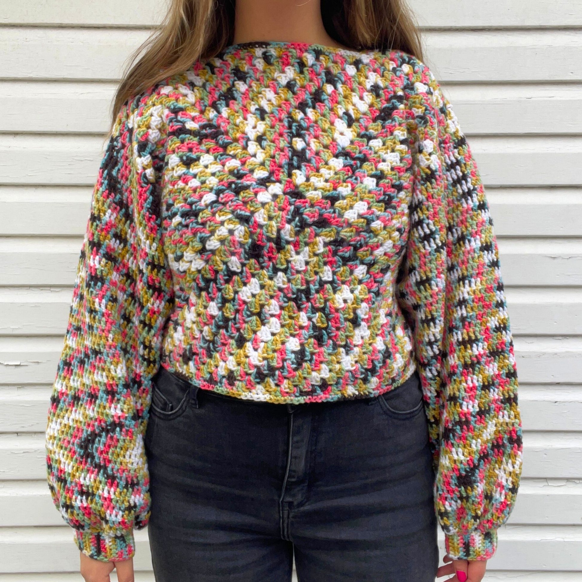This is a completely one of a kind handmade jumper! Simple design, boxy style fit with suuuper ballooned sleeves and chunky cuff details. I absolutely love these colours and the way the pattern has fallen on the sleeves in a wavy way - this yummy yarn speaks for itself.