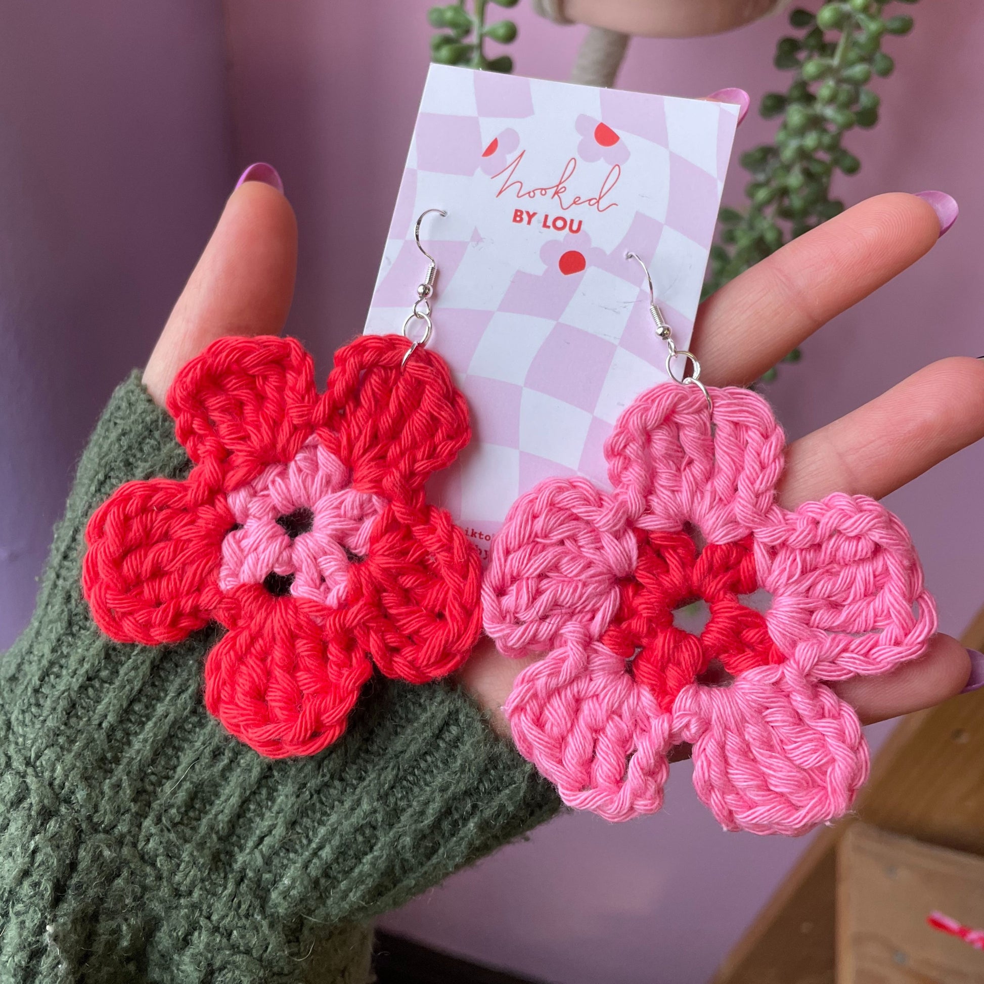 Handmade crochet flower earrings in red and pink! Adorable earrings to brighten up any outfit, and they would be a perfect gift for anyone that loves colour, crochet and anything vibrant.